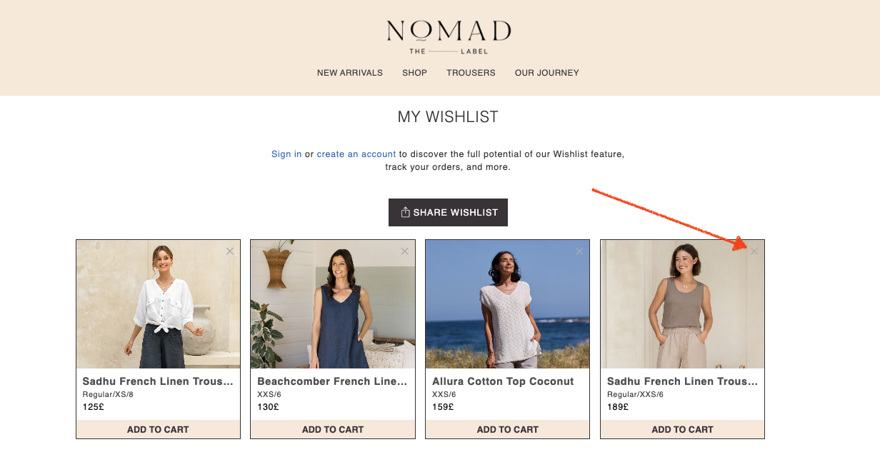 If you want to remove an item from your Wishlist, simply click the close button (x) at the top of the product image.